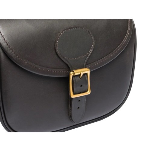 Leather cartridge bag with flap closure. Brass accessories, buckles and rivets. It can hold up to 100 cartridges in 12 gauge.