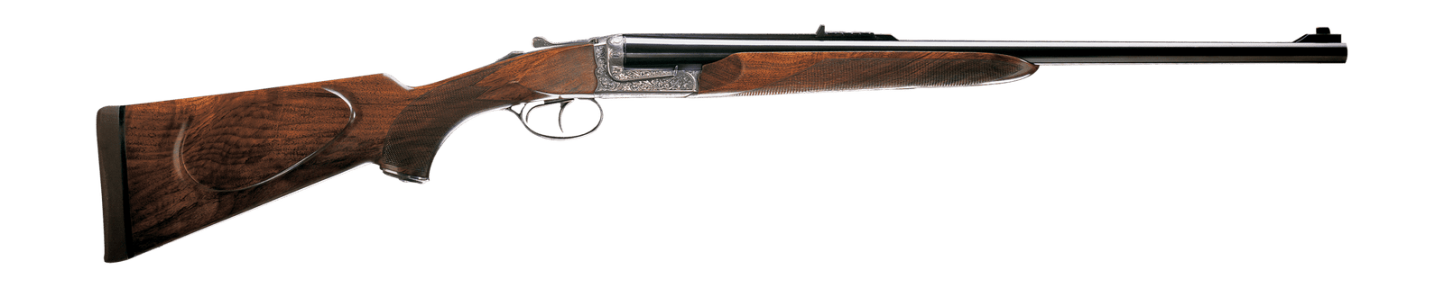Action with solid sidebars for strength, double-scalloped for a firm wood-to- metal fit. Double trigger “Blitz”-type battery. New deep-cut Royal style engraving motif, with a “al bulino” cape buffalo trophy on action bottom. Double parallel locking underlugs. Barrel length 600 mm (24 in.) or 650 mm (26 in.) depending on chambering. Quarter-rib with express-style rear sight with one fixed blade and three folding blades, prepared for scope bases installation. AAA Fancy walnut pistol grip stock with an english-style cheekpiece and an old english buttpad, hand-rubbed oil finish. Extended trigger plate with bordered, engraved trigger bow, reservoir engraved steel pistol grip cap. Comes in a moulded plastic case.