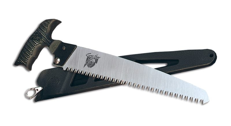 This practical field saw features a T-shaped handle to allow comfortable straight wrist cutting from any angle, which reduces fatigue during long use. The 8.0 inch 65Mn spring-steel blade with triple ground tooth pattern creates an aggressive cutting edge for penetrating tough bone and wood. The Griz-Saw comes complete with a locking, quick release, Zytel® sheath with swivel clip attachment.