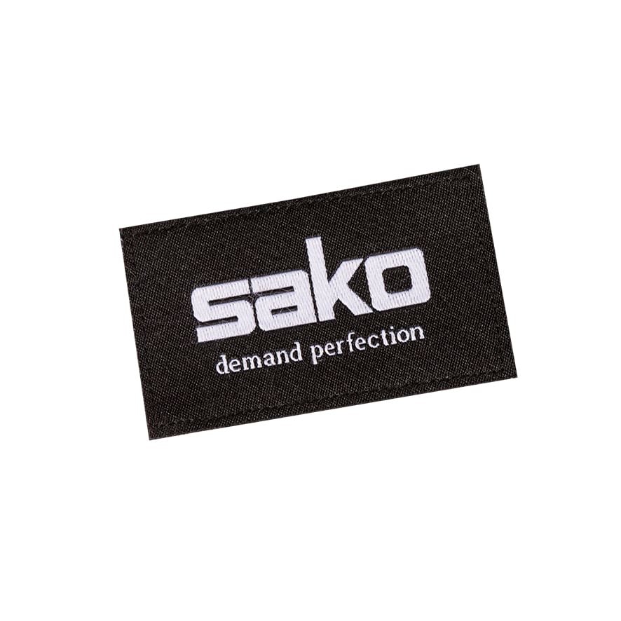 Textile velcro patch with Sako demand perfection logo. Easy to attach with velcro on cap, jacket etc. that have the velcro counter part.